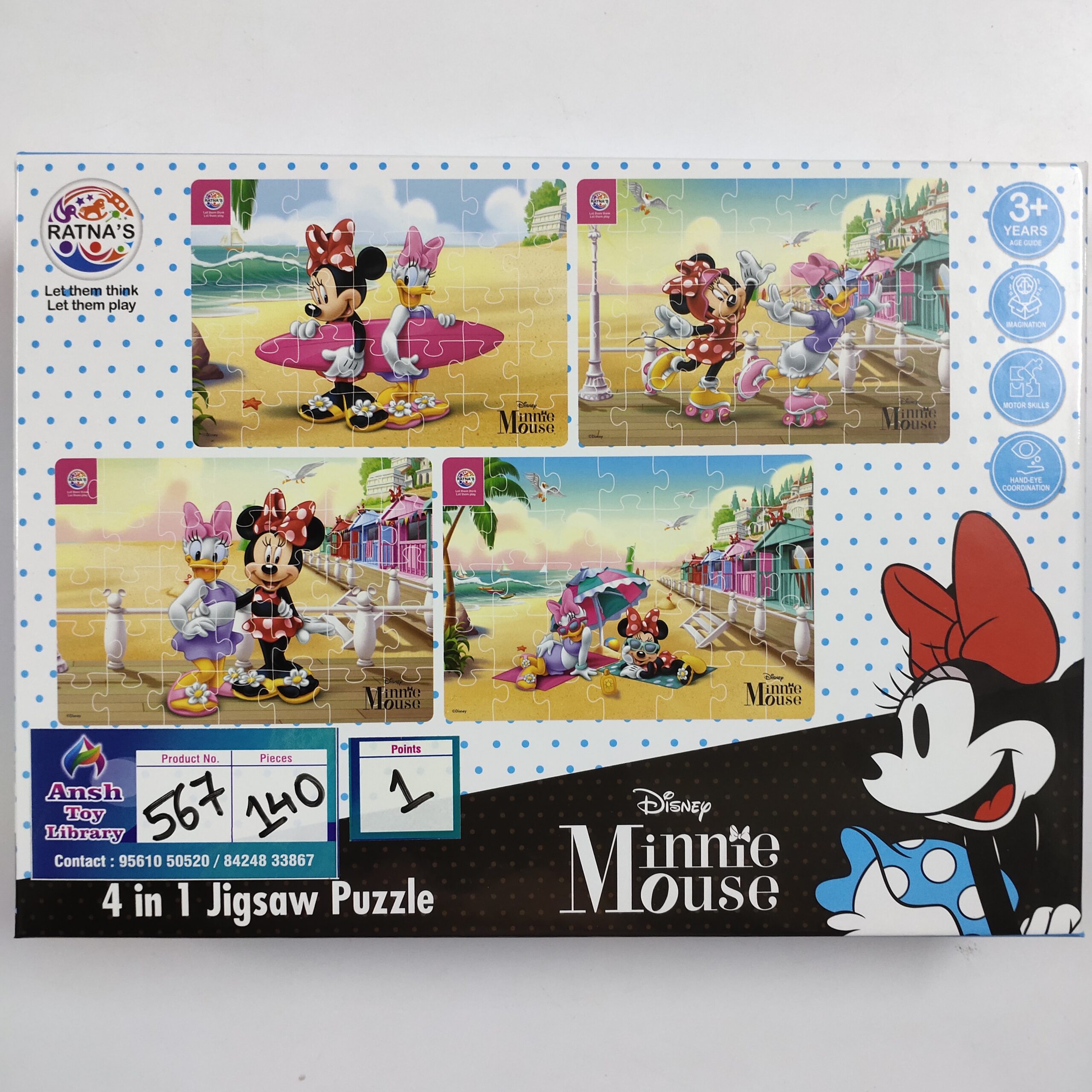 4 IN 1 JIGSAW MINNIE MOUSE 35 PIECES X 4 PUZZLES AGE: 3 YEARS+ POINTS: 1 See also different: 7-8 PCS PUZZLE SET 1 No. 1669 ALL SHAPES KNOB PUZZLE No. 559 WHALE-OWL (JIGSAW) No. 194 << return to products
