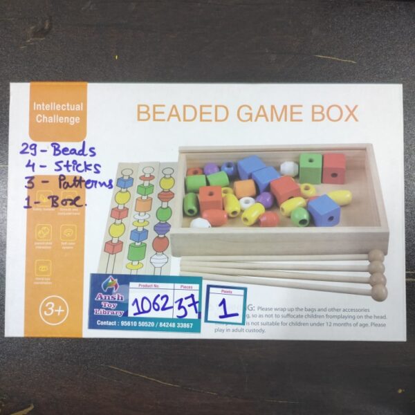 BEADED GAME BOX WOODEN BBQ STICKS AND BEADS AGE: 2 YEARS+ POINTS: 1 https://www.instagram.com/p/CxZVCXPp_ml/?hl=en See also different: DUCK PULL AND PLAY SENSORY TOY No. 1572 CURIOUS CUB LEVEL 6 No. 1112 KNOBBED CYLINDER No. 1007 << return to products