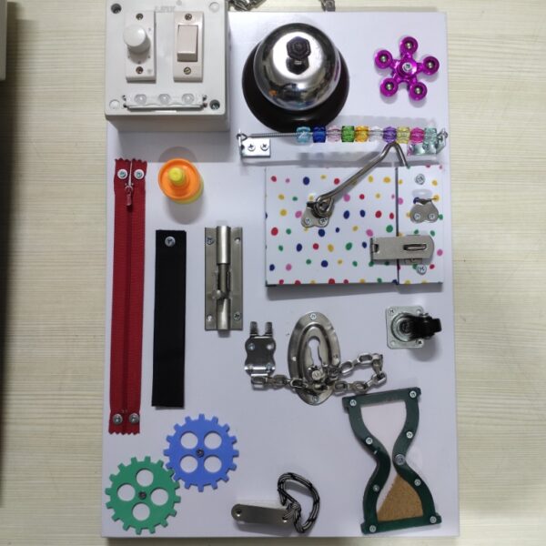 BUSY BOARD 6 AGE: 1 YEAR+ POINTS: 2 https://www.instagram.com/reel/C5p-0Pgp0eR/?hl=en See also different: COLOUR SORTING CUPS NO. 1941 SENSORY MAT 1 No. 912 DIGITAL BOARD No. 238 << return to products